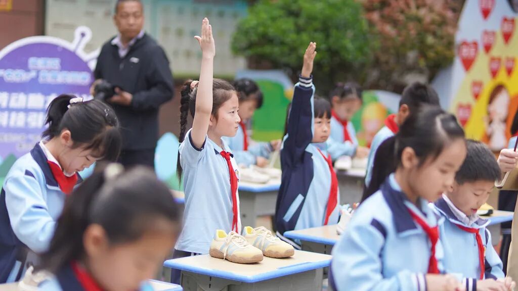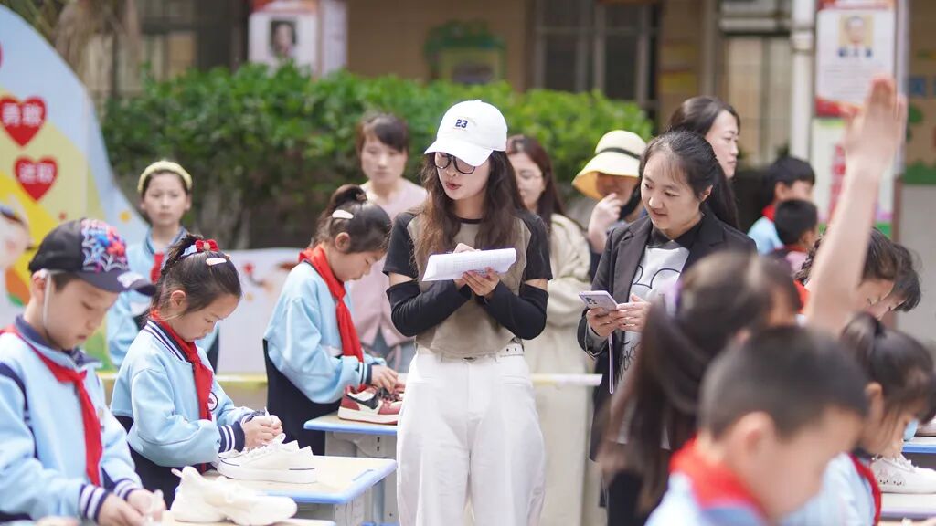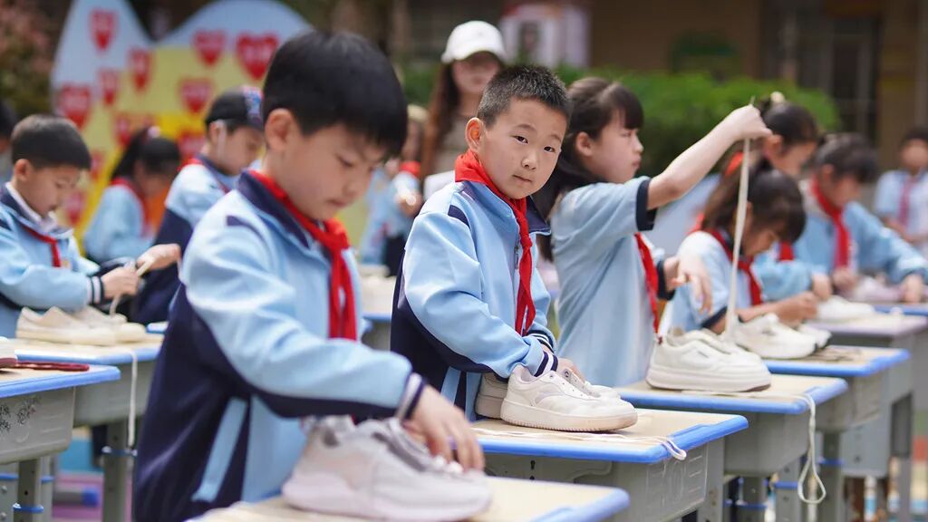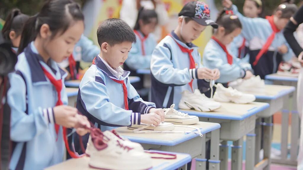 一二年级的“系鞋带大赛”中,小选手们动作娴熟、专注认真,在规定时间内完成蝴蝶结的系法比拼,小小鞋带系出了劳动的细致与耐心。