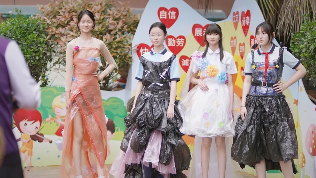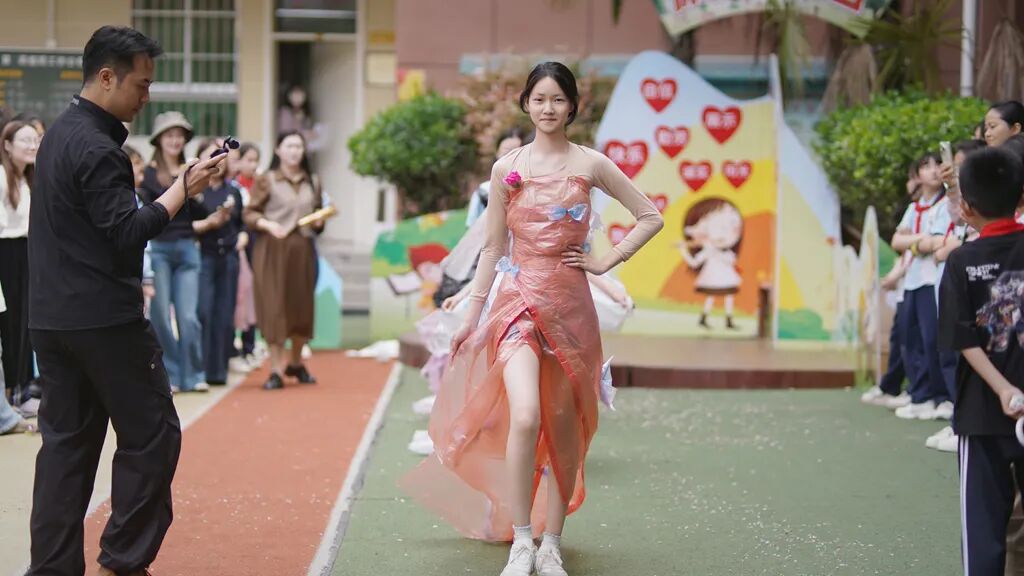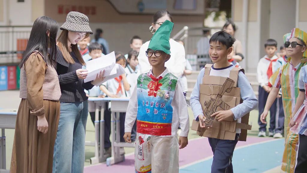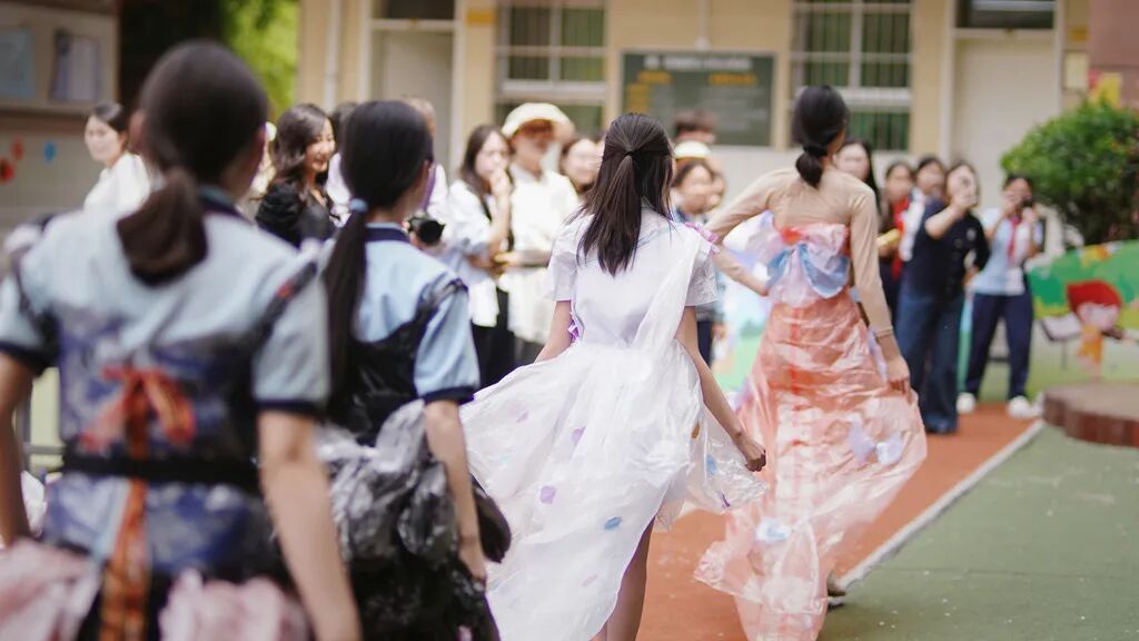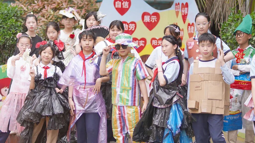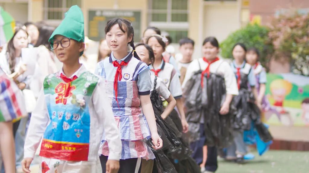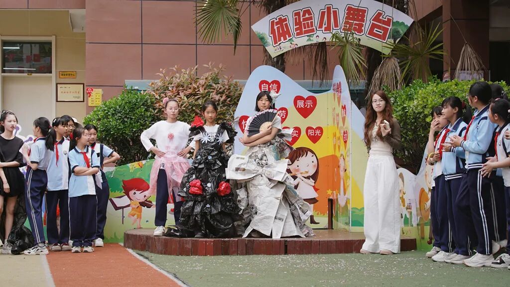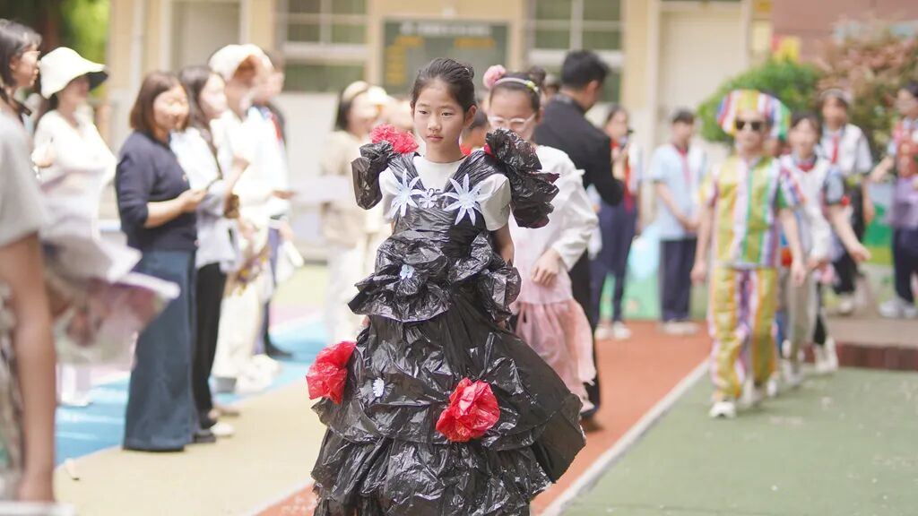 五六年级的“环保时装秀”将现场气氛推向高潮。废旧报纸、塑料袋、纸箱等材料,在同学们的巧手下变身为创意十足的环保服装。走秀环节中,学生们自信展示设计理念,彰显环保意识与审美表达。